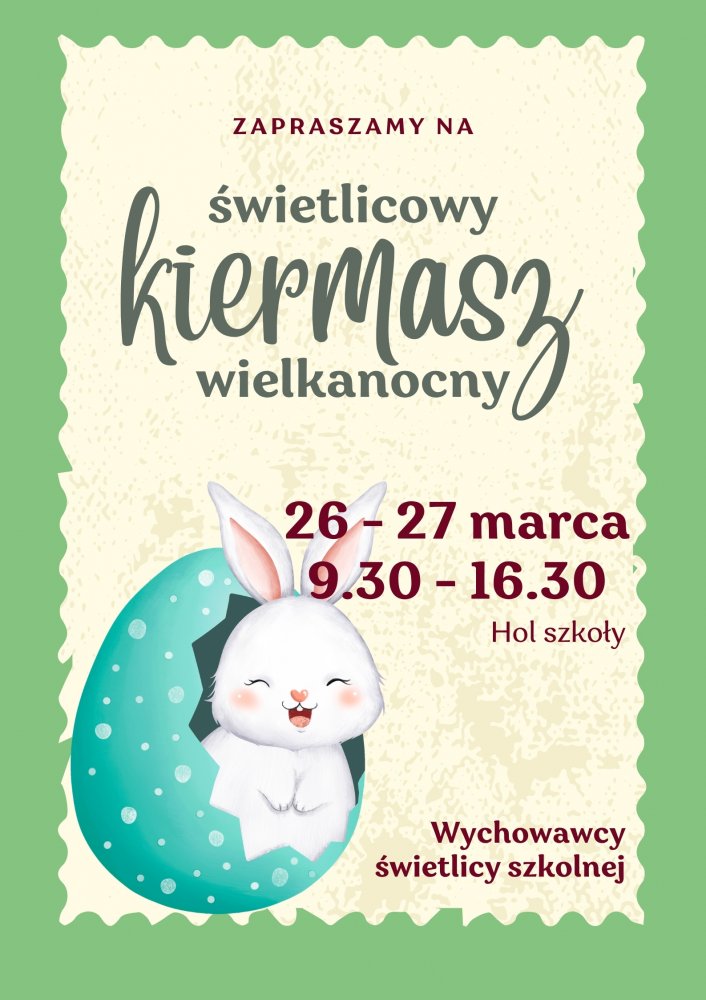Z radością informujemy, że w dniach 26 - 27 marca 2026 r. w naszej szkole odbędzie się coroczny kiermasz wielkanocny organizowany przez świetlicę szkolną.