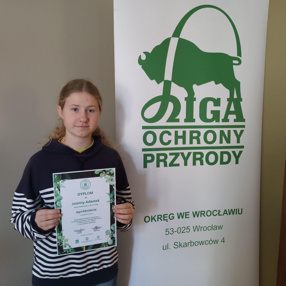 Uczennica klasy 8a Joanna Adamek została wyróżniona w wojewódzkim konkursie plastycznym „Rośliny chronione w Polsce”. Podsumowanie konkursu, zorganizowanego przez Ligę Ochrony Przyrody okręg we Wrocławiu, odbyło się dnia 3.10.2025 w siedzibie okręgu.