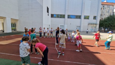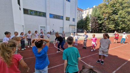 Piękna pogoda wciąż nas rozpieszcza, dlatego z radością korzystamy z promieni słońca i spędzamy czas na świeżym powietrzu. Uczniowie bawili się w różne gry – od piłki nożnej, przez berka i chowanego, aż po uwielbianą zabawę w „szczura” czy przeciąganie liny.
