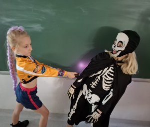 Było strrrasznie wesoło! Uczniowie przebrali się za duchy, czarownice i inne potworne stwory, głosowali na najlepszy kostium, rozwiązywali halloweenowe zadania i wymyślali przebranie dla swojej nauczycielki angielskiego!