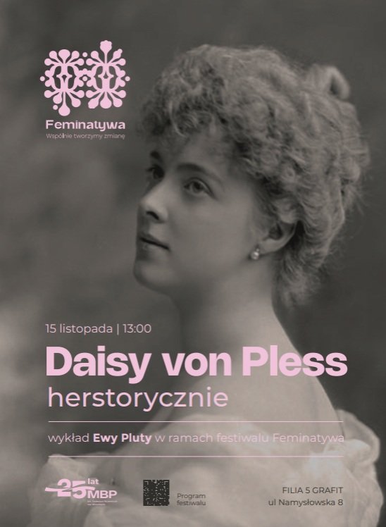 W bibliotece Grafit 15 listopada o godzinie 13.00 odbędzie się wykład herstoryczny w ramach wystawy „Daisy von Pless. Blask Książa i cienie historii”. O księżnej opowiadać będzie Ewa Pluta.