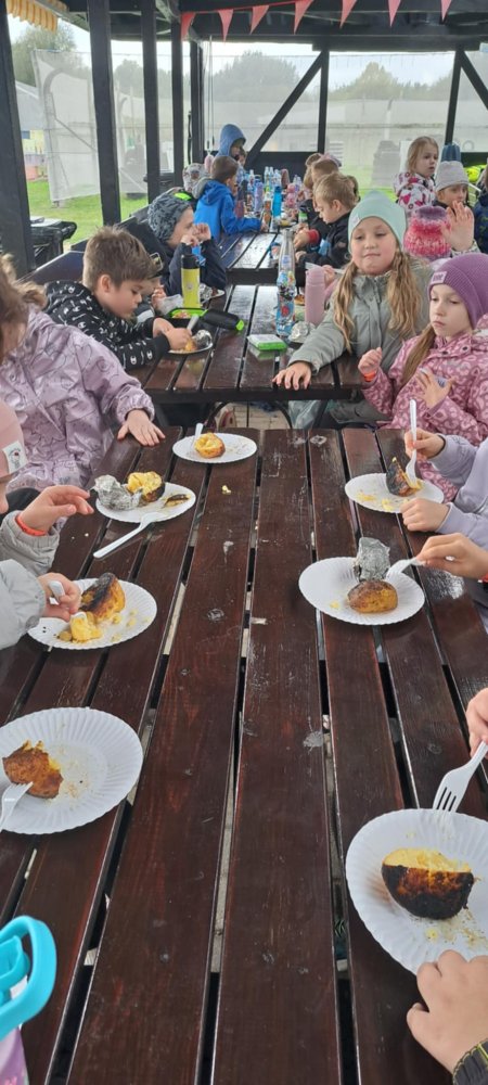Podczas warsztatów plastycznych dzieci własnoręcznie wykonały kolorowe medale, które mogły zabrać na pamiątkę do domu. Na zakończenie dnia wszyscy zasiedli przy ognisku, by zjeść pysznego pieczonego ziemniaka.