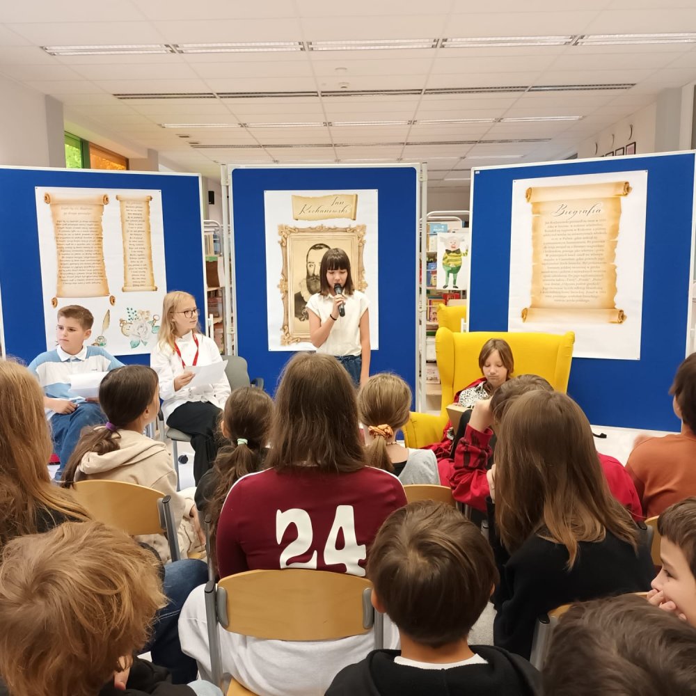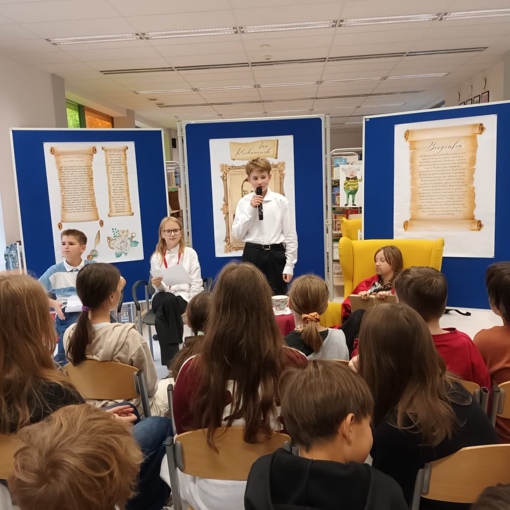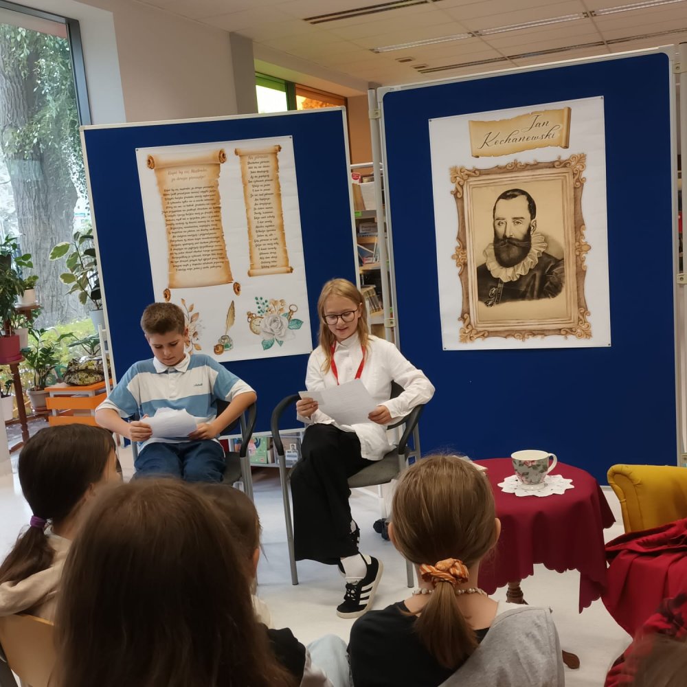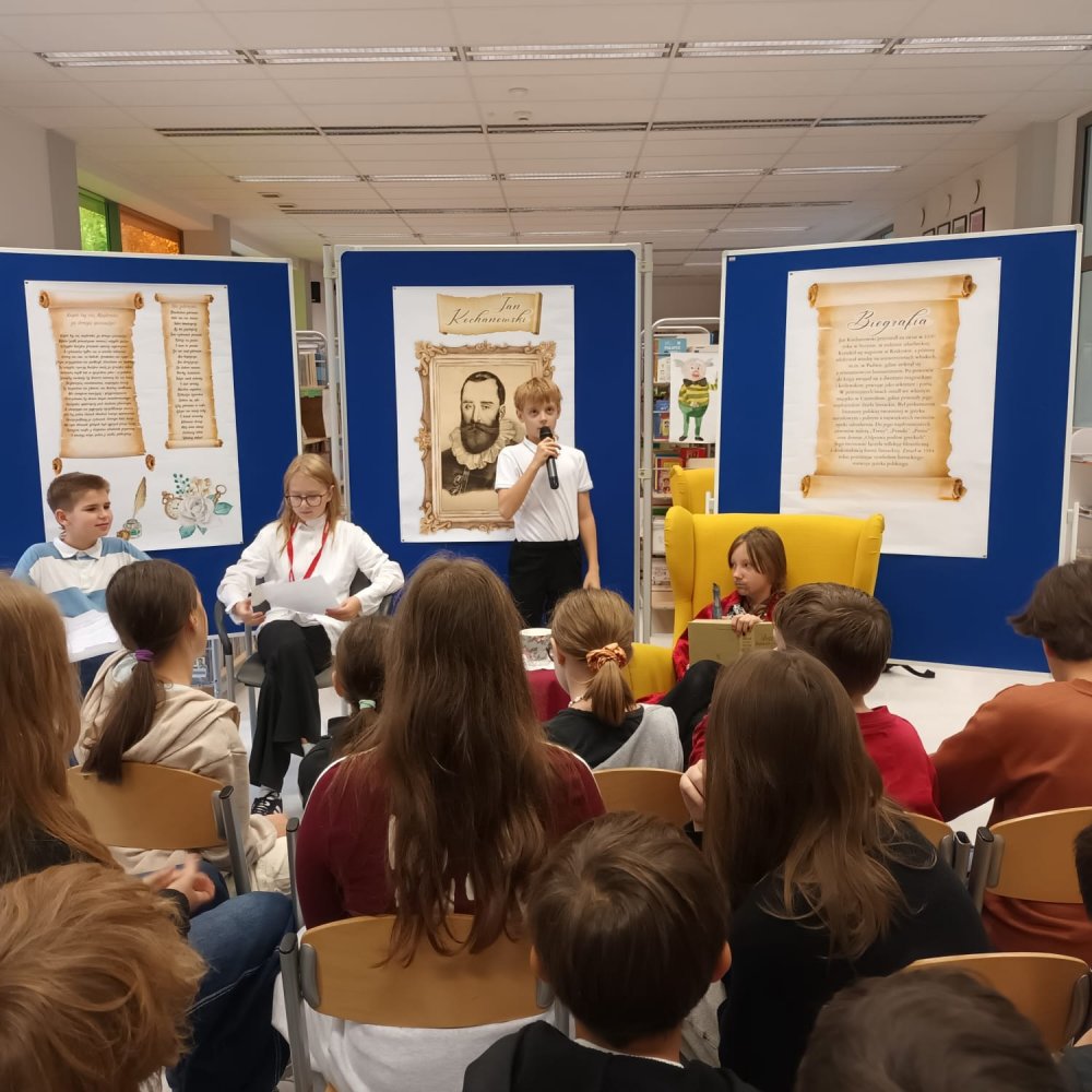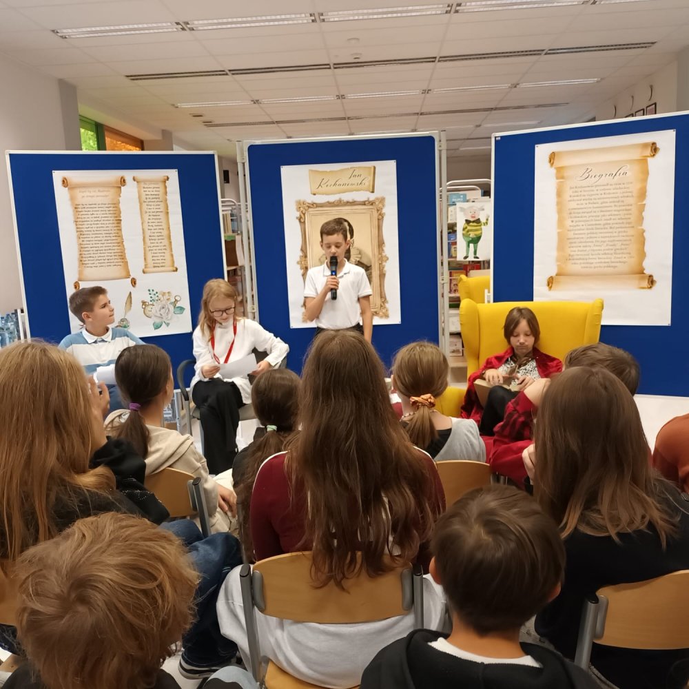 W spotkaniu uczestniczyli uczniowie klas piątych. Prowadzący: Iga Majchrzak i Felek Szewczuk wprowadzili zebranych w tajniki świata ojca literatury polskiej. Piątoklasiści recytowali fraszki, pieśni, treny poety. Następnie przedstawili prezentację na temat renesansowego twórcy. Poza tym przygotowali quizy i zadania dla zebranych, którzy za dobre odpowiedzi nagradzani byli słodkościami. Do biblioteki zawitał sam Kochanowski - w tej roli Martyna Dąbrowska. Wszyscy zebrani nie tylko poszerzyli swoją wiedzę na temat Jana z Czarnolasu, ale dobrze się bawili, stwierdzając, że lekcje języka polskiego też mogą być ciekawe.