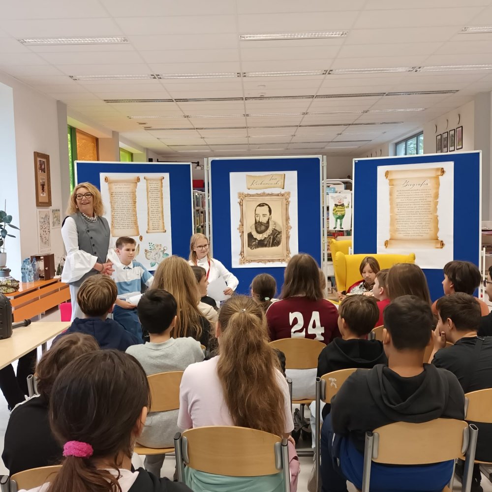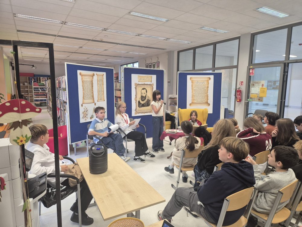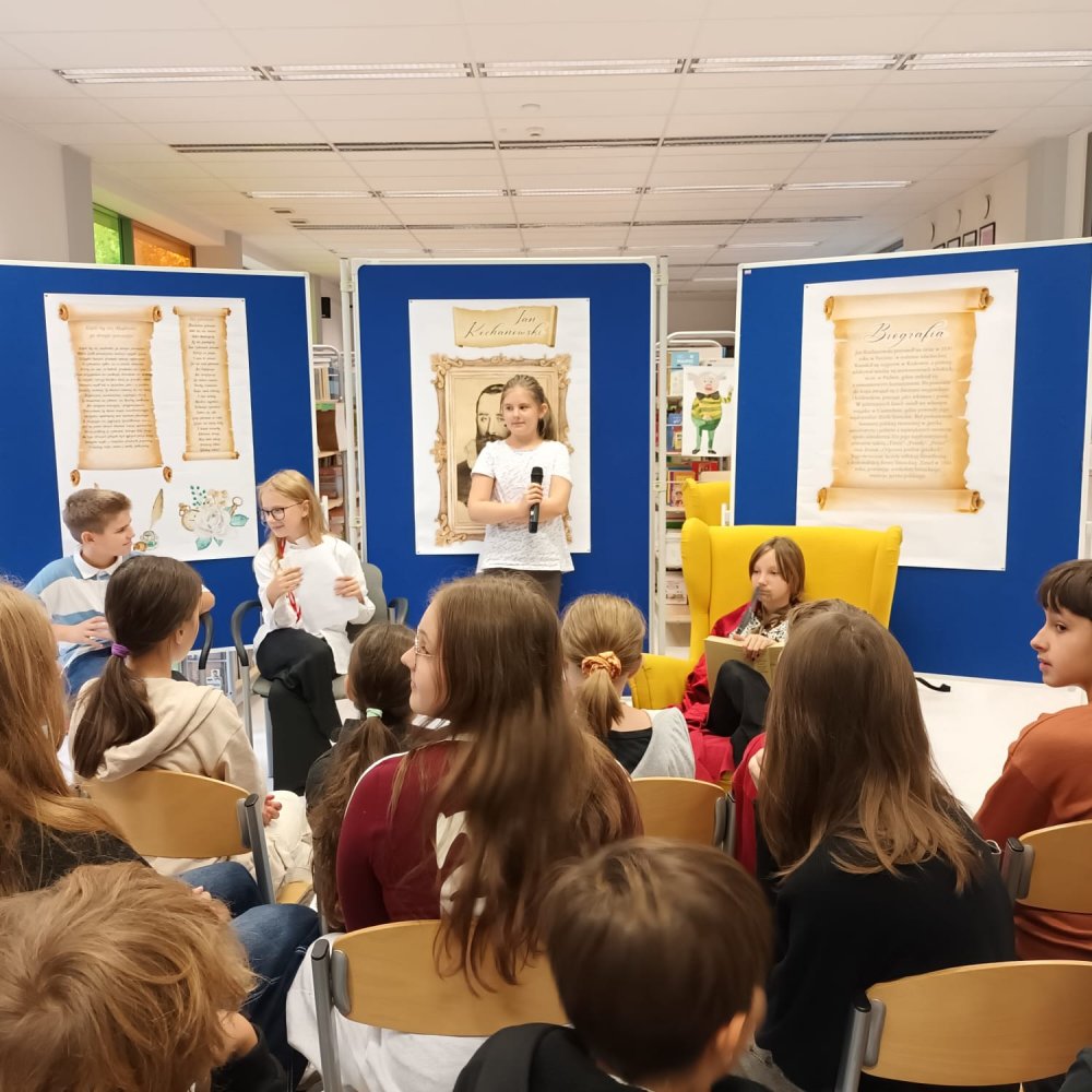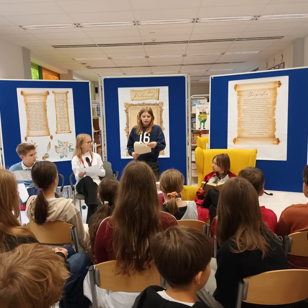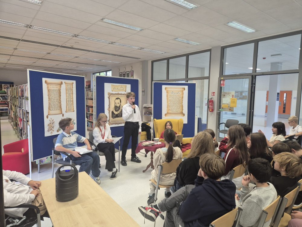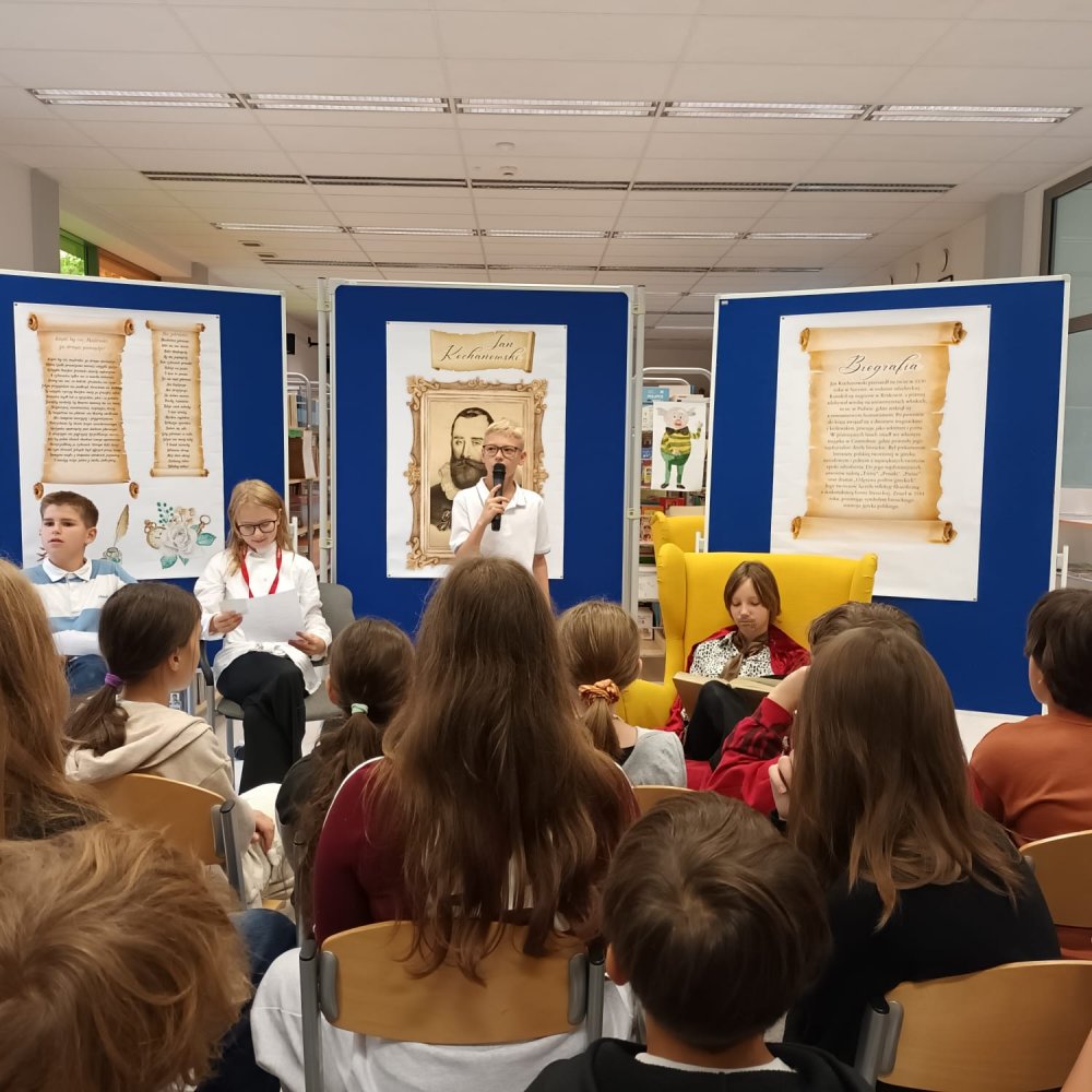 W spotkaniu uczestniczyli uczniowie klas piątych. Prowadzący: Iga Majchrzak i Felek Szewczuk wprowadzili zebranych w tajniki świata ojca literatury polskiej. Piątoklasiści recytowali fraszki, pieśni, treny poety. Następnie przedstawili prezentację na temat renesansowego twórcy. Poza tym przygotowali quizy i zadania dla zebranych, którzy za dobre odpowiedzi nagradzani byli słodkościami. Do biblioteki zawitał sam Kochanowski - w tej roli Martyna Dąbrowska. Wszyscy zebrani nie tylko poszerzyli swoją wiedzę na temat Jana z Czarnolasu, ale dobrze się bawili, stwierdzając, że lekcje języka polskiego też mogą być ciekawe.