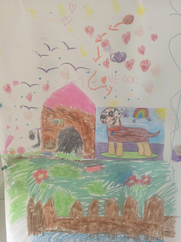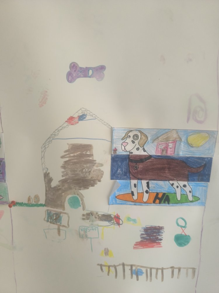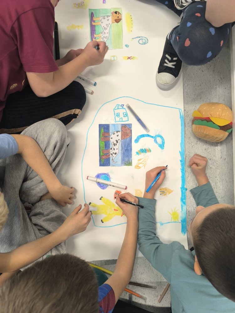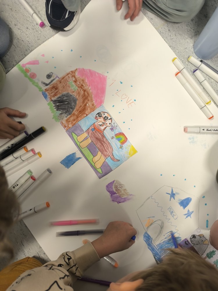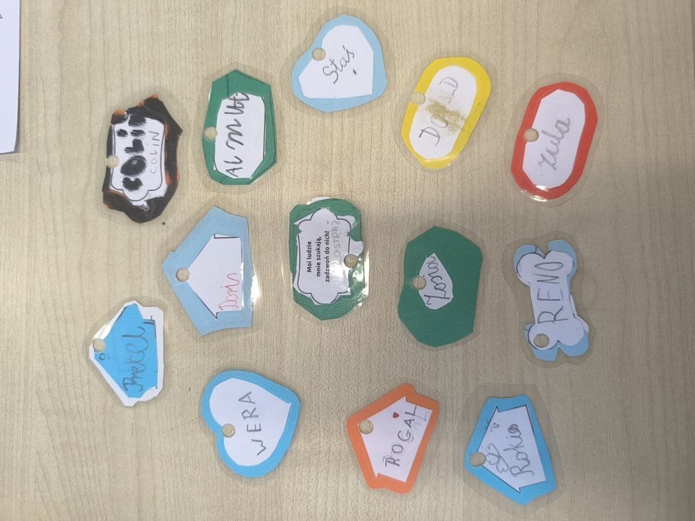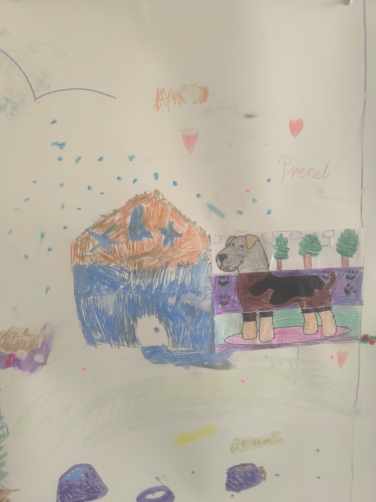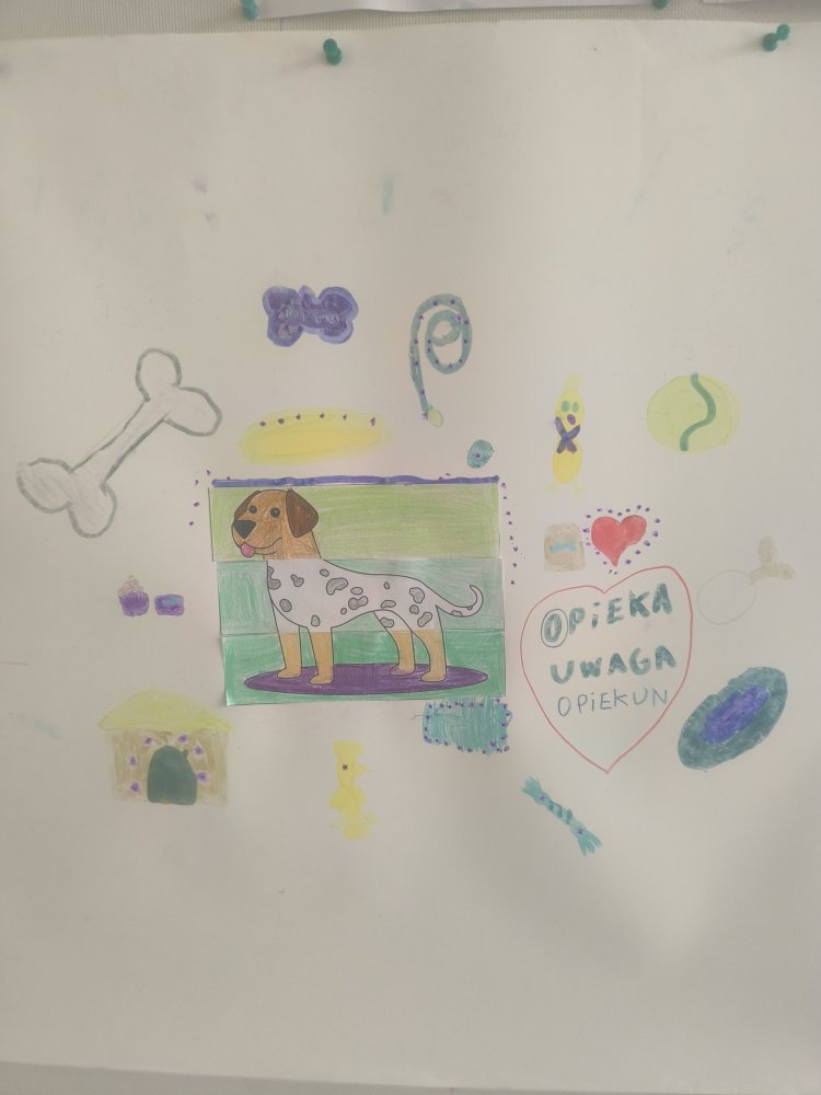 Podczas zajęć uczniowie mieli okazję wykazać się kreatywnością – z różnych części ciała piesków (głowa, tułów i łapy) stworzyli własne „mieszanki ras”, symbolizujące kundelki. Powstałe prace zostały przyklejone na dużym brystolu, a wokół nich pojawiły się rysunki przedstawiające rzeczy potrzebne psu – miski, smycze, legowiska, a także słowa takie jak: opieka, miłość, zabawa, odpowiedzialność.