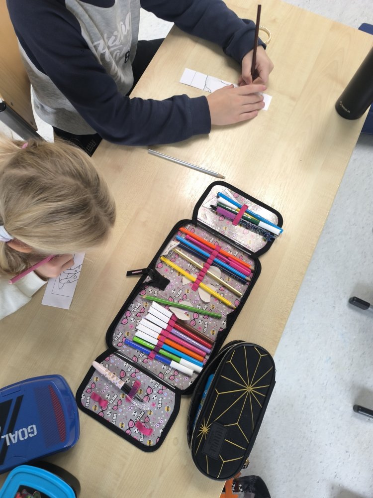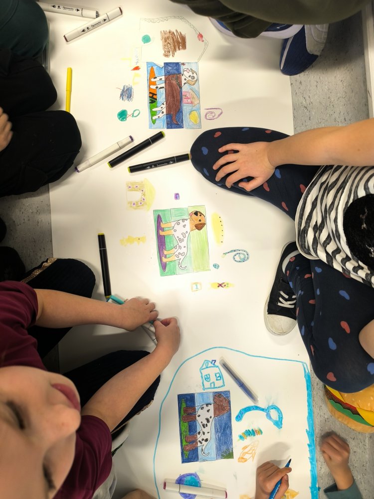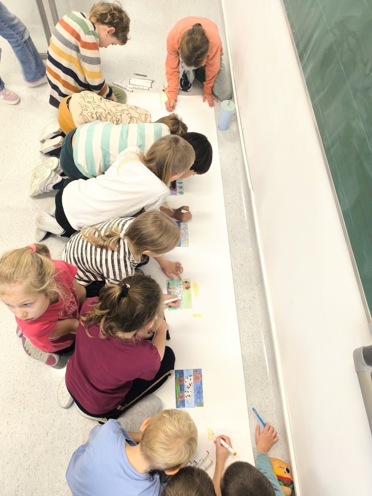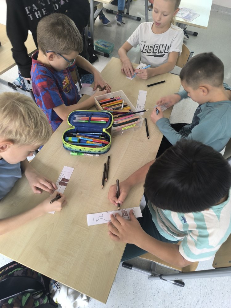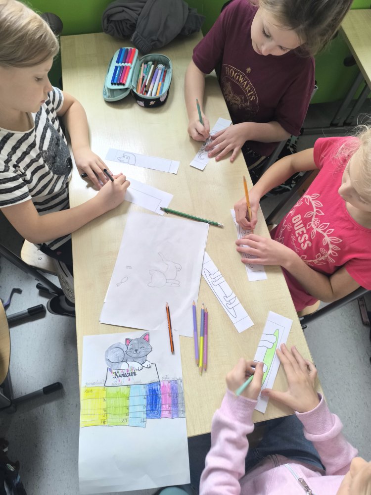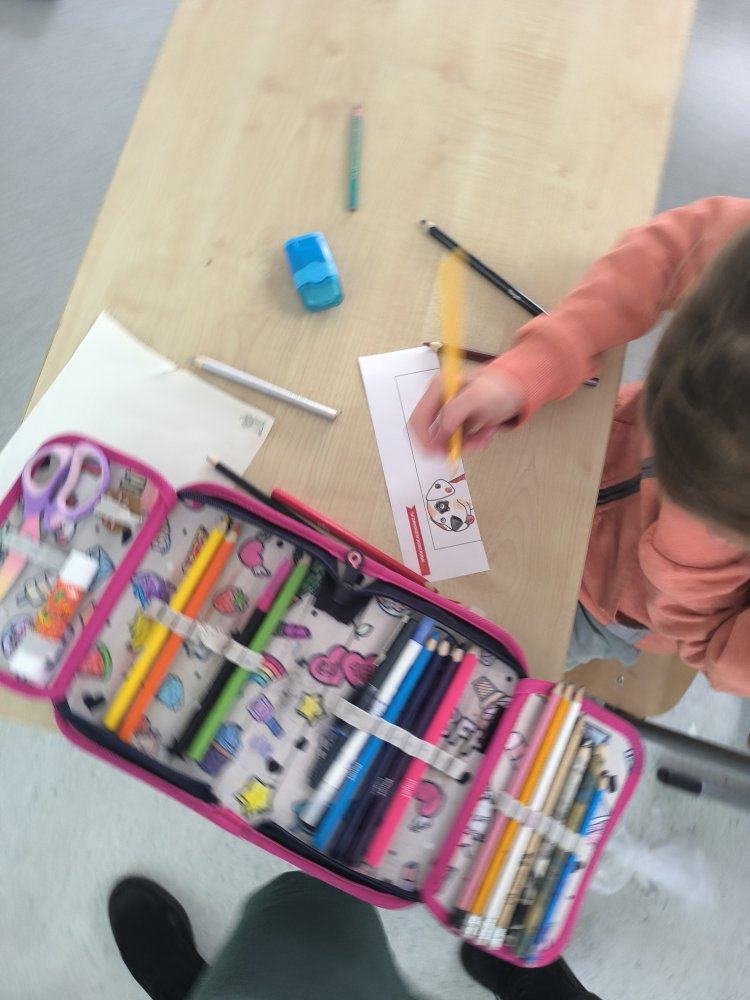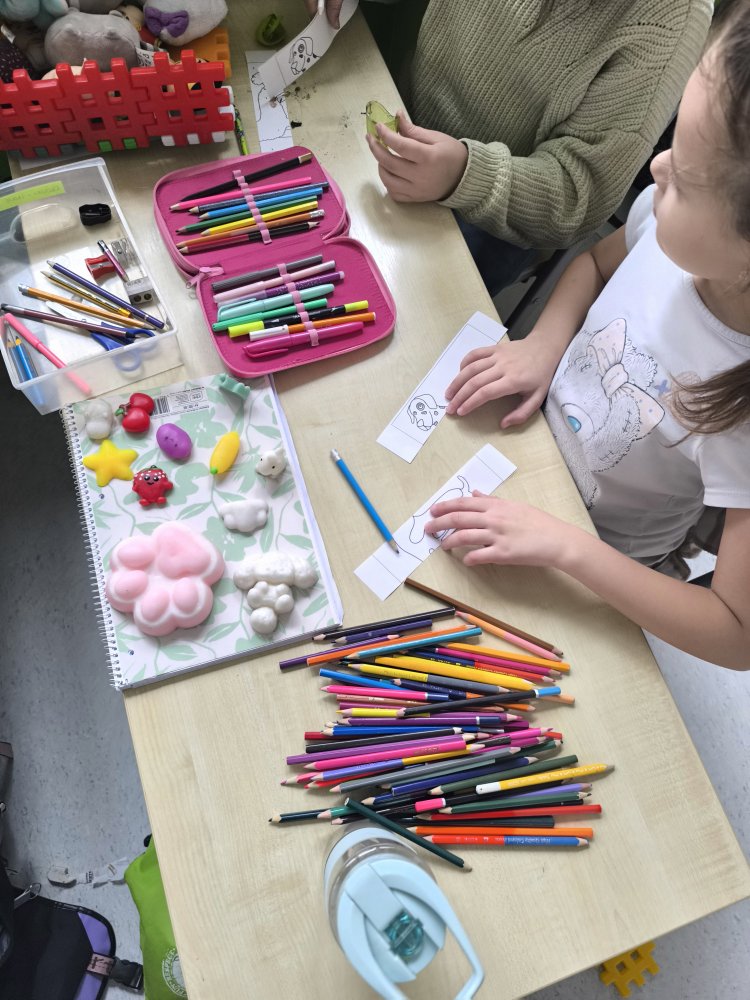 Podczas zajęć uczniowie mieli okazję wykazać się kreatywnością – z różnych części ciała piesków (głowa, tułów i łapy) stworzyli własne „mieszanki ras”, symbolizujące kundelki. Powstałe prace zostały przyklejone na dużym brystolu, a wokół nich pojawiły się rysunki przedstawiające rzeczy potrzebne psu – miski, smycze, legowiska, a także słowa takie jak: opieka, miłość, zabawa, odpowiedzialność.
