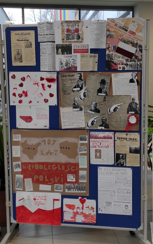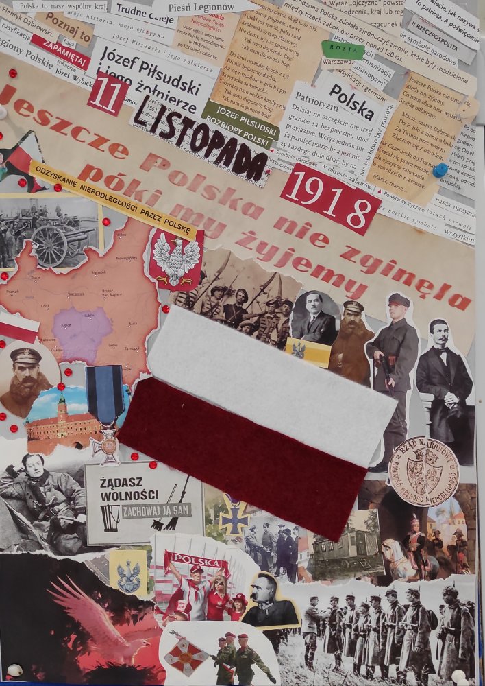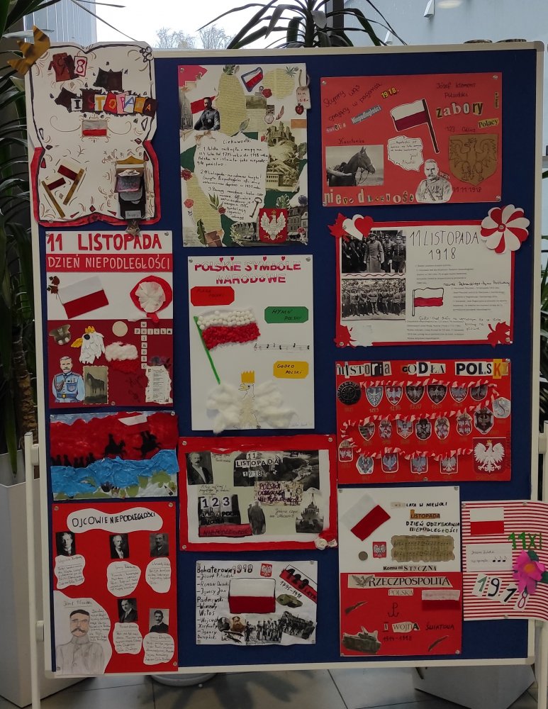 Klasy piąte i szóste przygotowały kolaż nawiązujący do wydarzeń i postaci, które przyczyniły się do odzyskania w 1918 roku naszej NIEPODLEGŁOŚCI. Klasy czwarte napisały życzenia dla Ojczyzny i cudownie je ozdobiły.