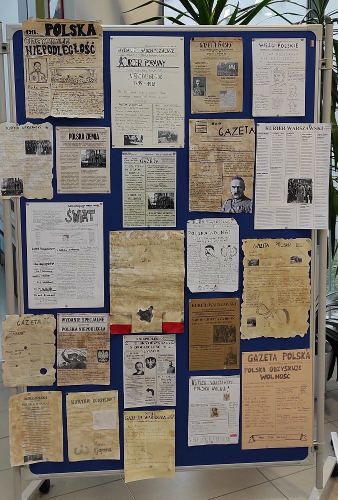 Klasy siódme i ósme zaprojektowały graficznie pierwszą stronę gazety z 1918 r., w której podjęły temat odzyskania przez Polskę NIEPODLEGŁOŚCI i faktów z tym związanych na przestrzeni 123 lat walki o wolność.