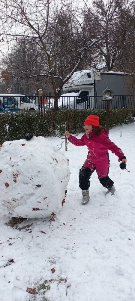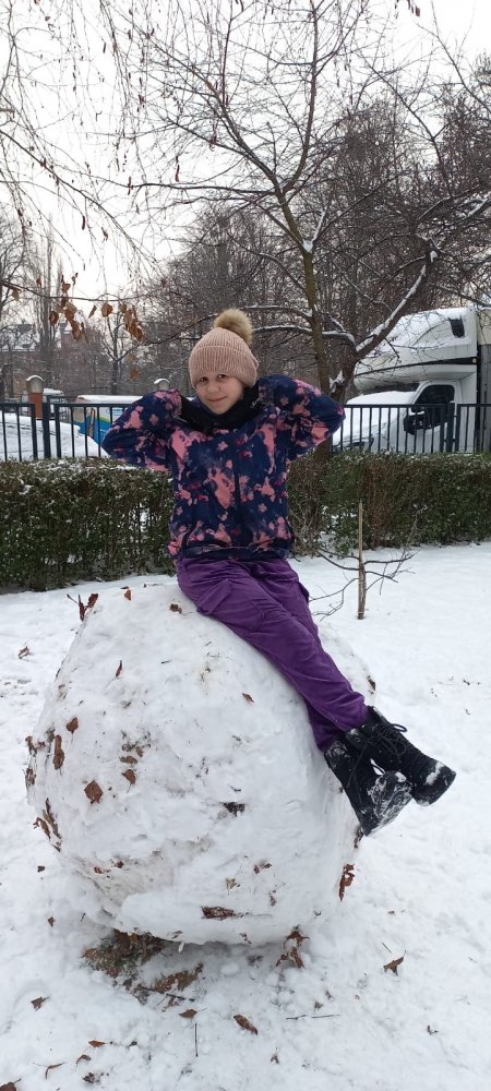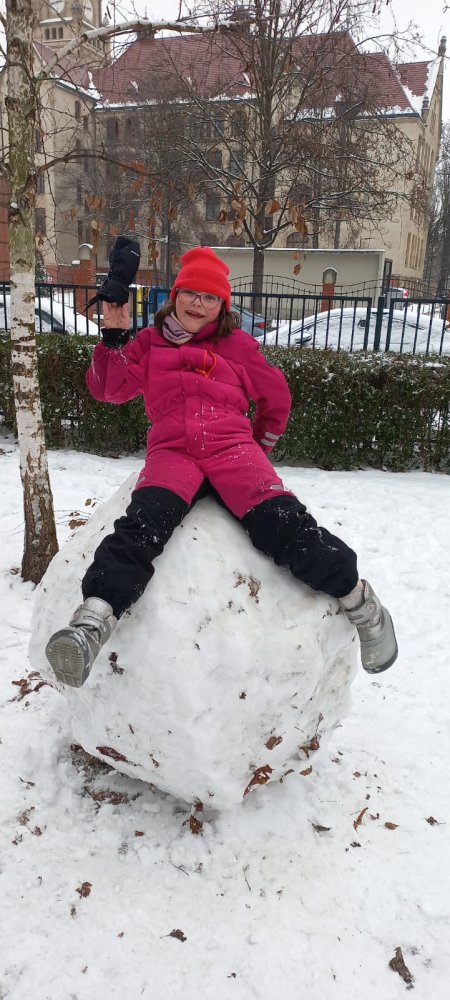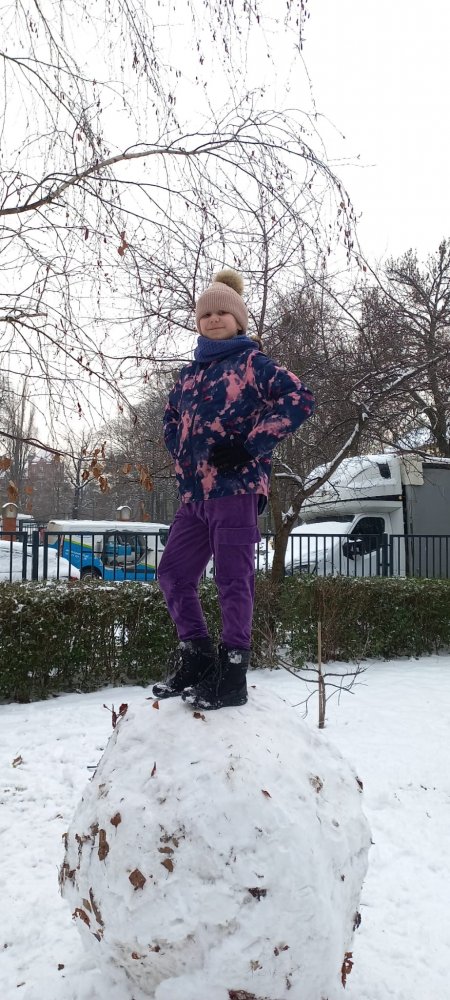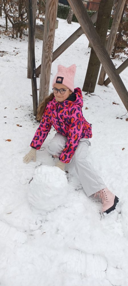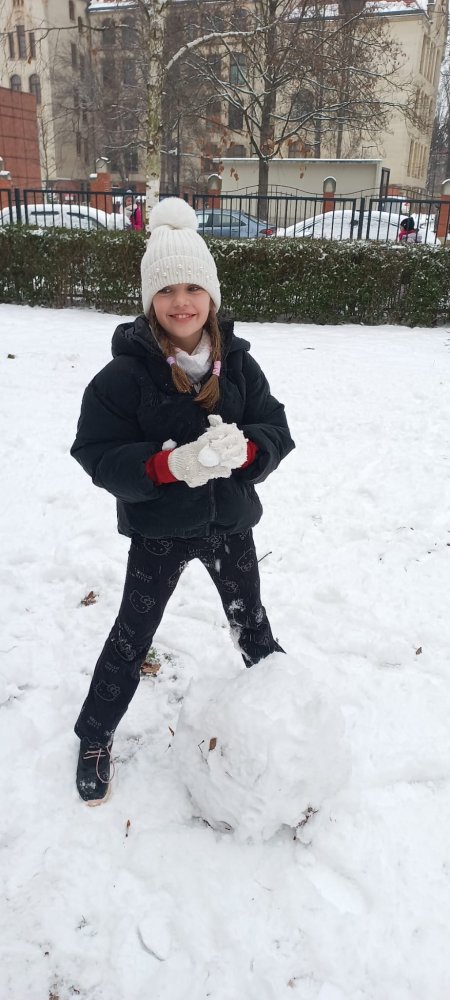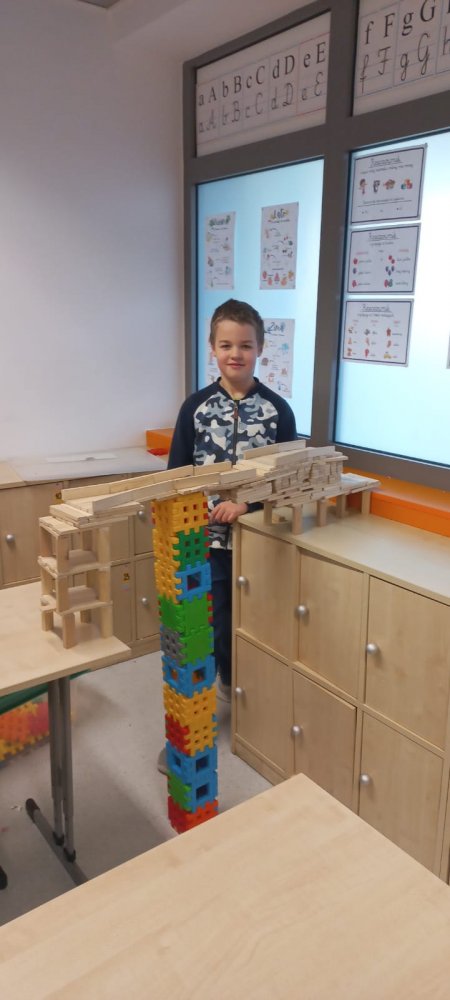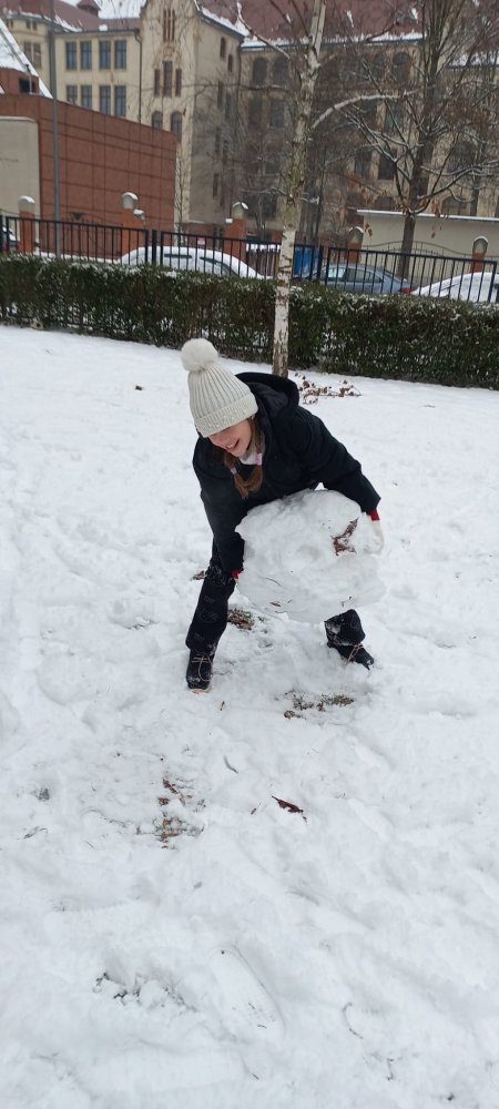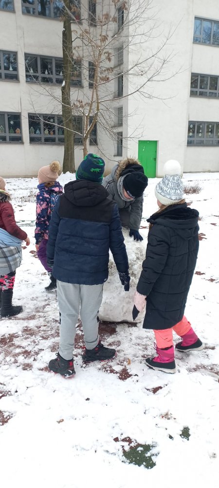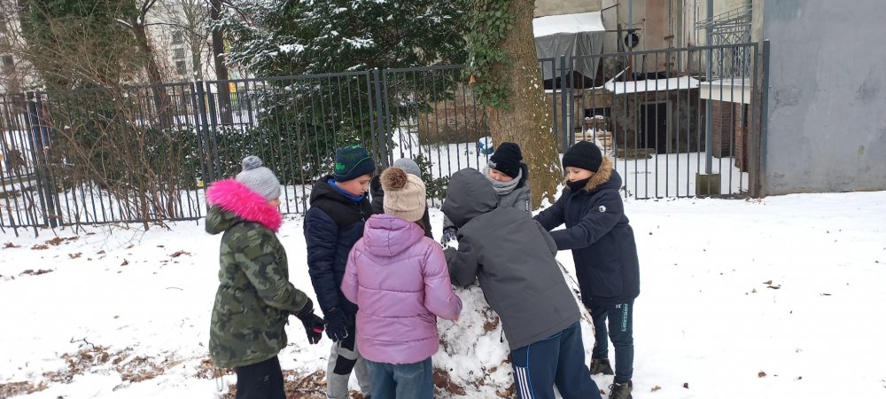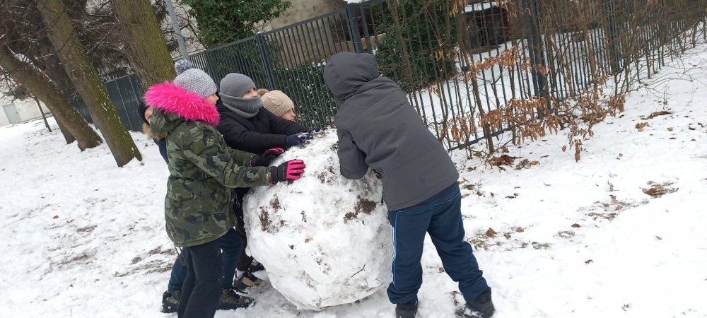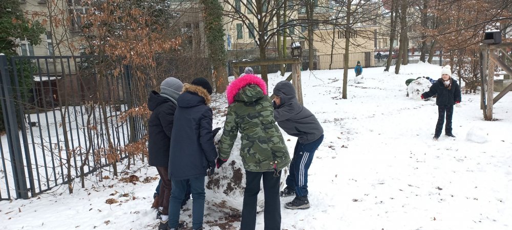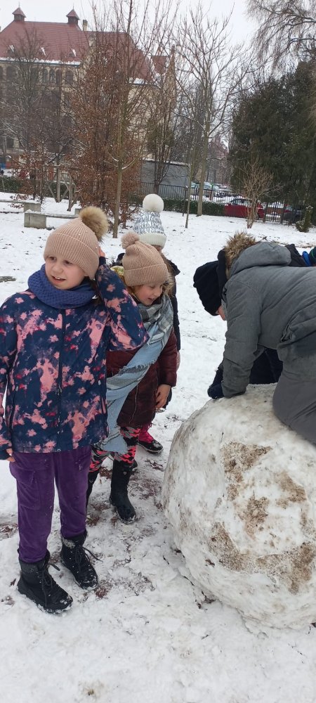 Zimowa aura sprzyjała zabawom na dworze - lepili ogromne kule śnieżne i cieszyli się śniegiem. Nie zabrakło też twórczej zabawy klockami w klasie.
