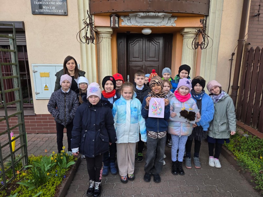 Dnia 27 marca 2026 roku uczniowie klasy 2c wraz z wychowawcami wybrali się na wielkanocną świąteczną wizytę do Domu Opieki Społecznej przy ulicy Grunwaldzkiej, czyniąc ten dzień wyjątkowym dla obu stron. Dzieci z dużym entuzjazmem i zaangażowaniem przygotowały się do tego wydarzenia, aby jak najlepiej wyrazić swoją radość i serdeczność wobec mieszkańców domu opieki.